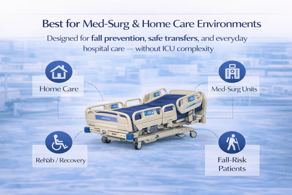 Best for: Med-surg units, rehab facilities, and home-care environments prioritizing fall prevention, safe transfers, and caregiver ergonomics, without the complexity or cost of ICU-level smart beds.
